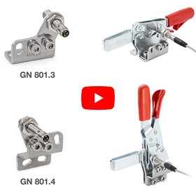 | | Držači senzora GN 801.3 i GN 801.4 | Držači senzora GN 801.3 i GN 801.4 izvedeni su kao pribor za brze stezaljke serija GN 810 i GN 820 i omogućuju beskontaktni nadzor položaja za stezanje s pomoću induktivnog senzora. Kada je zatezna poluga u položaju za stezanje, elektronika senzora šalje visoki signal, npr. upravljačkom sustavu stroja, i dodatno signalizira ovo preklopno stanje putem LED diode na senzoru. | | |